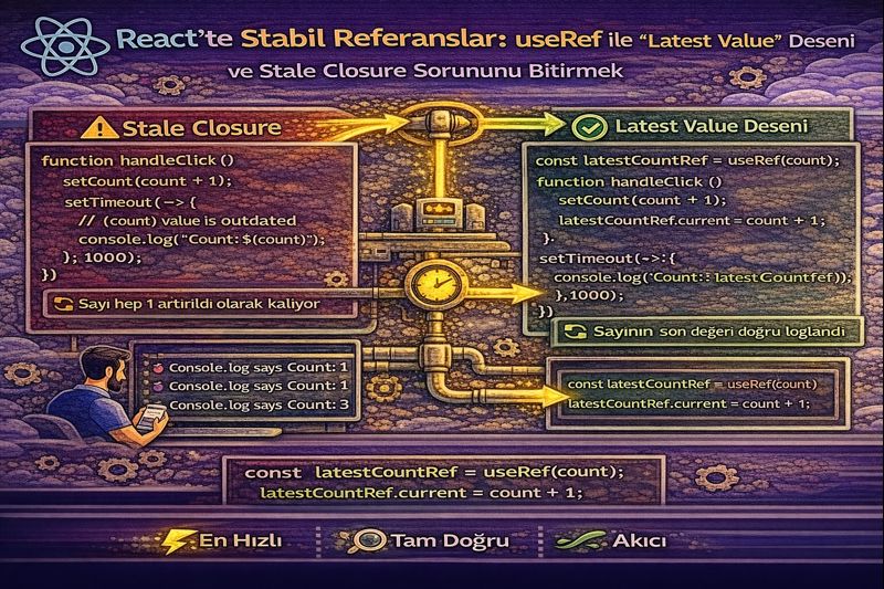 Stale closure kaynaklı hataları, useRef tabanlı “latest value” deseniyle güvenli ve okunabilir şekilde çöz.