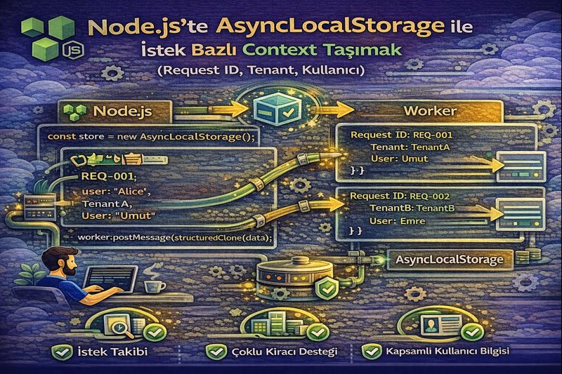 Modern Node.js uygulamalarında en can sıkıcı problemlerden biri şudur: Bir HTTP isteği boyunca requestId, kullanıcı bilgisi veya tenant gibi verileri her fonksiyona parametre olarak taşımak zorunda kalırsınız. Bu hem kodu kirletir hem de hata yapma ihtimalini artırır.