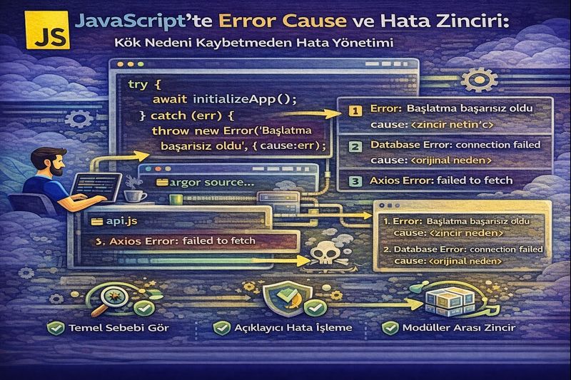 Error cause, JavaScript’te hata yönetimini “mesaj üretmekten” çıkarıp izlenebilir bir hata hikayesi haline getirir. Bir sonraki üretim hatasında “nerede patladı?” yerine “neden patladı?” sorusuna daha hızlı ulaşırsınız.