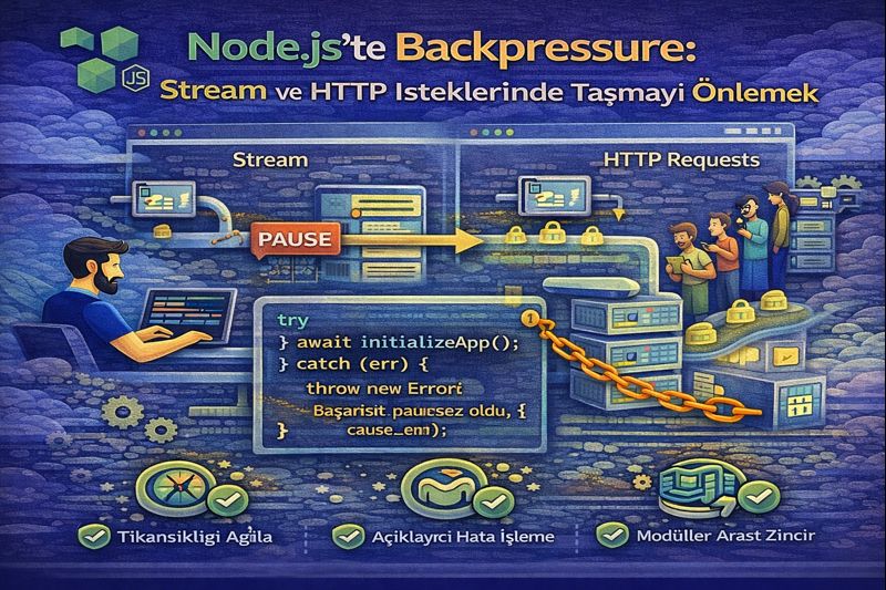 Backpressure doğru kurgulandığında Node.js uygulamanız “hızlı” olmaktan öte, yük altında da öngörülebilir ve dayanıklı olur.