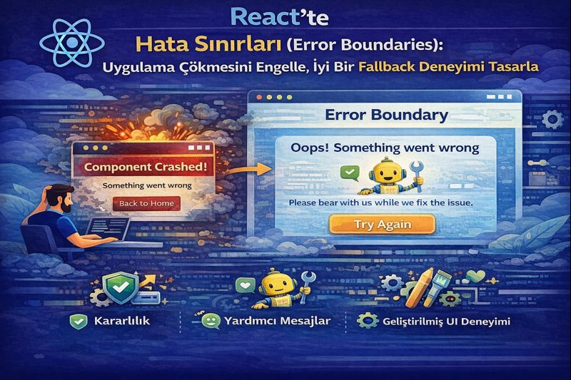 React uygulamalarında her şey yolundayken bile “beklenmeyen” bir hata tüm ekranı beyaza çevirebilir. Bu noktada Error Boundary (Hata Sınırı), uygulamanın tamamen çökmesini engelleyip hatayı izole etmenizi ve kullanıcıya anlamlı bir fallback UI sunmanızı sağlar.
