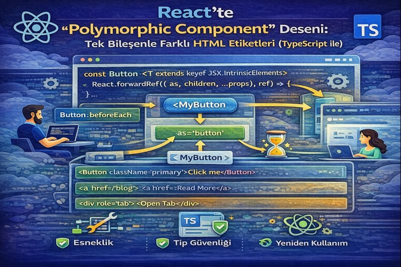 Polymorphic component deseni, tasarım sistemi benzeri yapılarda tek bileşenle doğru HTML semantiğini koruyarak tekrar kullanım sağlar. TypeScript ile kurulduğunda, hatalı prop kullanımını daha yazarken yakalarsınız.
