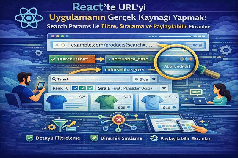 React uygulamalarında liste ekranı yaparken filtreler, arama kutusu ve sıralama seçenekleri genelde useState ile tutulur. Sonuç: sayfayı yenileyince her şey sıfırlanır, link paylaşınca aynı görünüm yakalanamaz, geri/ileri (back/forward) davranışı tutarsızlaşır.